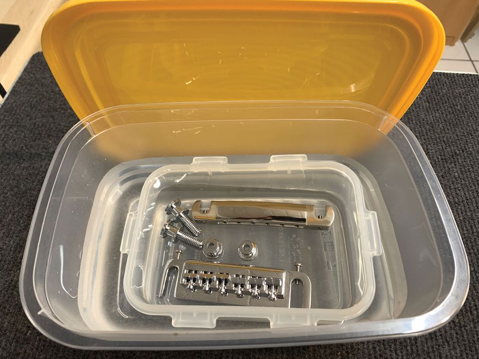 You may have heard of the aging method using hydrochloric acid (aka muriatic acid) for hardware. This is a good alternative for the parts we have in the works now. So, why didn't I mention this earlier? For a very good reason: We started with the metal parts of the tuners, and even if you close the hole in the case carefully, more than enough acid fumes will creep into the guts of the tuner, causing corrosion inside. This often results in non-turning tuners that you'll have to replace. The only procedure that's safe for this is to take the tuners apart and only age the cases. We're talking about a very strong acid, so before we start, here are the basic rules to follow to be safe: