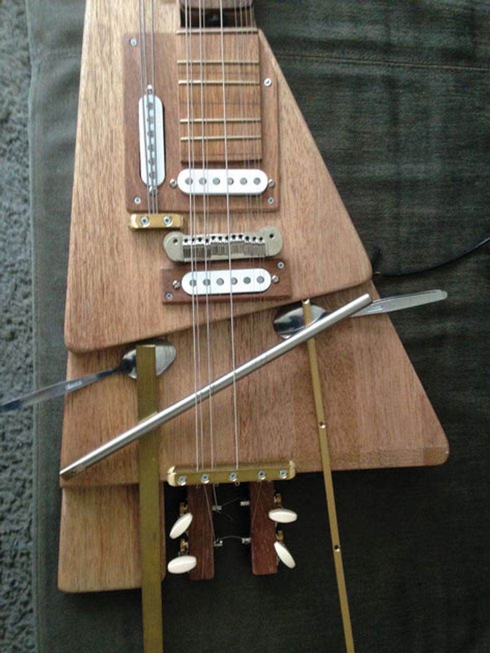 You’ll probably also notice that I abandoned the holes at the 7th fret and drilled extra holes in the headstock near the standard 6th- and 7th-string locations. Why? Unlike the thinner strings that begin at the 12th fret—which work very nicely and yield a dreamy, mandolin-like drone—I found the result with low strings starting at the 7th fret too impractical—a nasty, rumbly, out-of-tune situation that didn’t work with my playing skills.