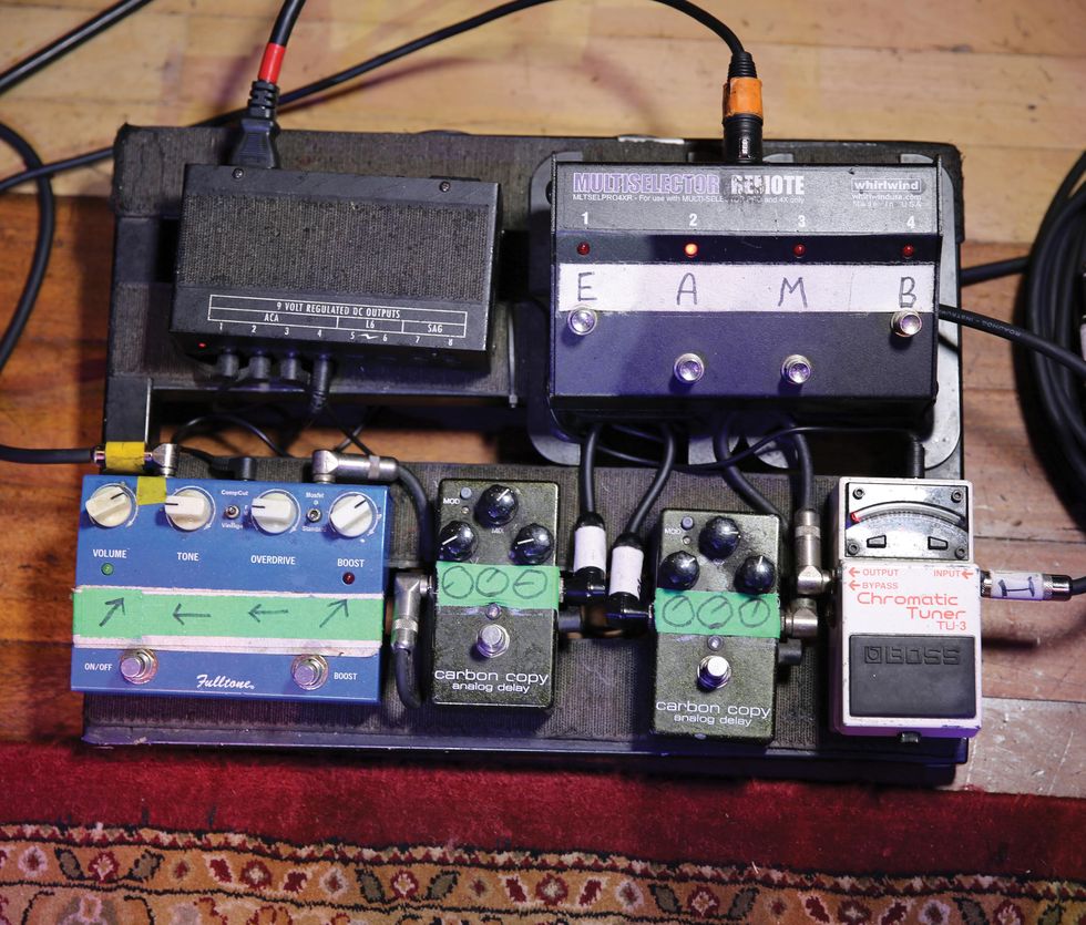 The board that was the closest thing to gig-ready had a Fender Marine Layer Reverb, a vintage Pearl CH-02 Chorus, an old Boss DM-2 Delay, an Ibanez CF7 Chorus/Flanger, and an Electro-Harmonix Holy Grail (left side). Meanwhile, the right side of the board was home to menace: a Marshall Blues Breaker, an SNK Pedals VHD distortion/preamp, a Keeley-modded Boss BD-2 Blues Driver, and a Klon Centaur. Everything was powered by a Strymon Zuma and controlled by a Carl Martin Octa-Switch MkII. His tuner was a TC Electronic PolyTune 2 Mini, and his volume pedal was an Ernie Ball VPJR.