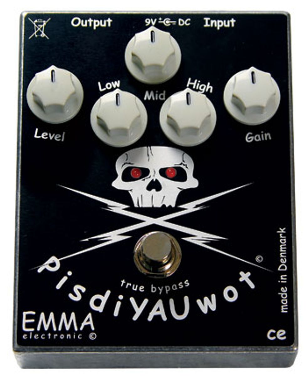 The PisdiYAUwot comes in the standard EMMA aluminum box (approximately 3 ½”x 4 ½”) with a badass skull and lightning bolt graphic and two red LEDs that light up like eyes when you engage the effect. A total of five controls cover Level, Bass, Mid, Treble, and Gain. Input and Output jacks are on the top front of the pedal with a 9VDC input between them. You can also power it with a 9V battery, accessed by four Phillips machine screws on the back panel. The pedal uses Emma’s “Untrue Bypass” circuit, a buffered bypass that the manual says is “way better” sounding.