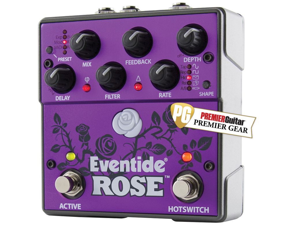 You can approach Eventide’s latest stompbox two ways: If you dive in without consulting the documentation, you’ll encounter a straightforward delay pedal with magnificently warm and musical sounding echoes. If you go by the book—pamphlet, actually—and plumb the Rose’s hidden features and secondary knob functions, you’ll uncover a powerful processor capable of many unexpected sounds.