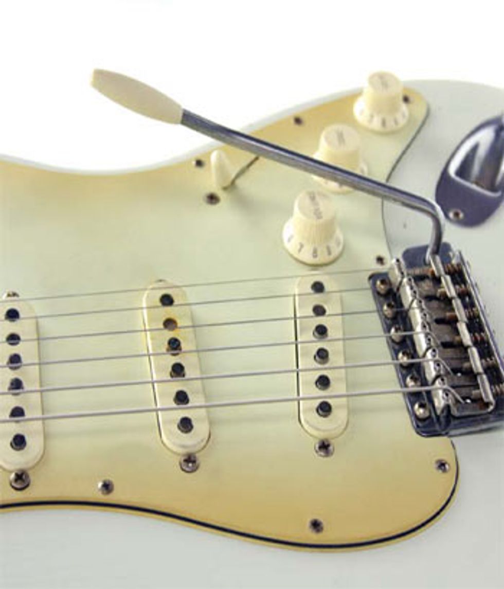 Running a pair of fingers over the body revealed the wounds to be real, some deeper than others. The distressed finish can certainly be differentiated from the feel of the bare wood, which adds to the effect Fender is aiming for. The back of the neck was a different story, however. Possibly the most important characteristic of a vintage guitar is the way the neck feels in the player’s hand— it can make or break the decision to buy. While the edges of the fretboard felt like they’d been rolled off to maximize comfort, the worn parts on the back of the neck didn’t really feel different from the areas where the lacquer is easily visible. Although there are heavily worn areas on the neck, the un-worn areas felt exactly the same, as if the finish had been worn away, then sealed over again. It seems to detract from the purpose of replicating those worn areas for comfortable feel and grip that players used to have to work so long and hard to create. Up close, the worn away portions of the back of the body seemed a little contrived, as well. This might have more to do with the fact that it was white, as the Tele seemed more accurate with its worn yellow-to-white-primer areas (more on that in our Tele review). Tonally, the Road Worn Stratocaster sounded a little more open than the Mexican Standard model we compared it with. Structurally, the guitar is similar to its Mexican Standard brethren, except that the Road Worn Strat sports a set of Tex Mex single coils with Alnico magnets, vintage style tuners and a nitrocellulose finish. The combination of upgraded pickups and thin finish allows the sound to bloom and sustain more. The guitar just seems more vibrant and responsive, and the vibrations through the wood are more noticeable than with the Mexican Standard. This could also be due to the additional wearing of the finish—a great side effect of the distress treatment. Fender really did an excellent job in crafting this instrument. It may not beat its Custom Shop Relic cousins, but it can certainly hang in there with them.