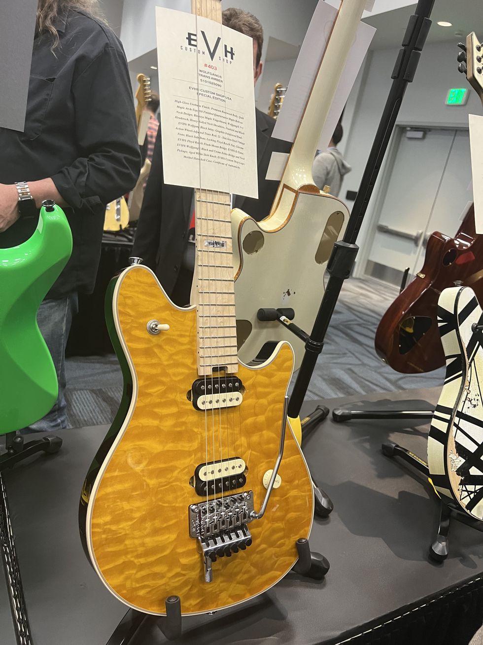 EVH's custom shop was quite busy as well. As an unapologetic fan of '90s Van Halen, the finish on this Wolfgang Trans Amber brings back so many memories. Along with the basswood body and Quilt Maple arched top, it has 22 stainless steel frets, EVH Floyd Rose bridge, and Wolfgang Black and Creme Zebra humbuckers. Streets at $5,800.