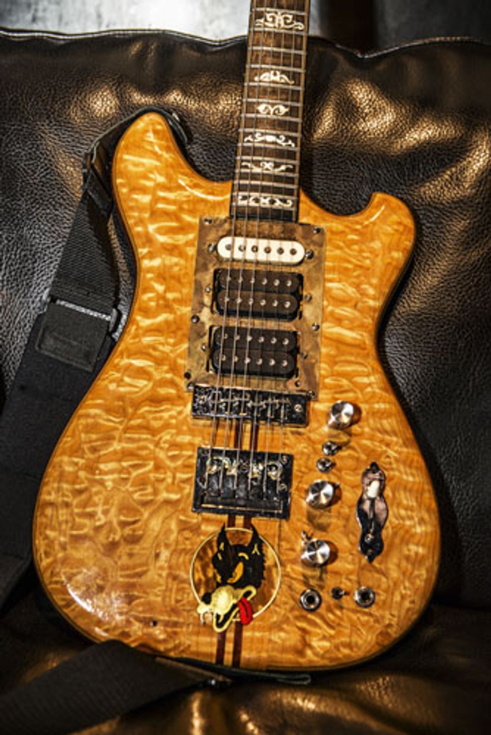 “So I built the next guitar for him,” Irwin recalled in the same interview, “which I had actually started building at the time he ordered it; it was made out of purpleheart [also known as amaranth, a South American wood] and curly maple. It had an ebony fingerboard and mother-of-pearl inlays. This is the one that became the ‘Wolf.’”