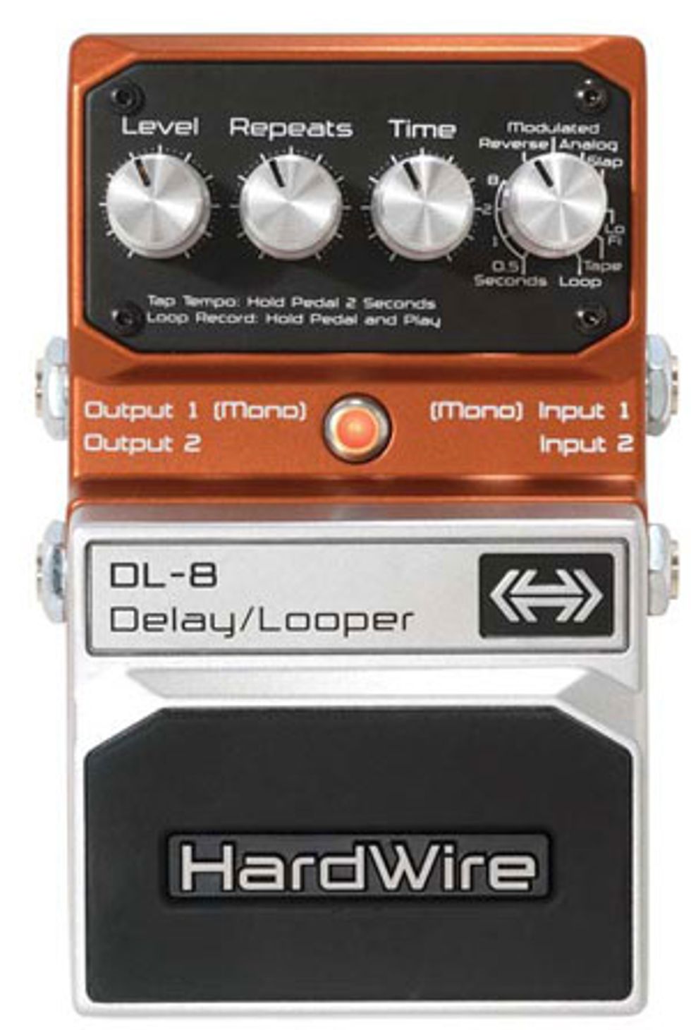 The DL-8 Delay/Looper combines a very basic looper function with lots of super-cool delay settings. The four rock-solid adjustable knobs give you the ability to control the Level, Repeats, delay Time, and six delay modes: Reverse, Modulated, Analog, Slapback, LoFi, and Tape. You also get four digital settings, a Looper setting, and a Tails on/off switch feature. You can have all these sounds in mono or stereo. The tap tempo is easy to use when you need to get in time with the music, and you can get delay times ranging from 10 milliseconds to 8 seconds. Overall, the layout is very easy to use, and you’ll have fun making up wacky delay settings that you would probably never use in an actual band situation. You’ll also get a kick out of the Reverse mode. The Looper gives you 20 seconds of recording time, but unfortunately there’s no way to save it and call it up later.