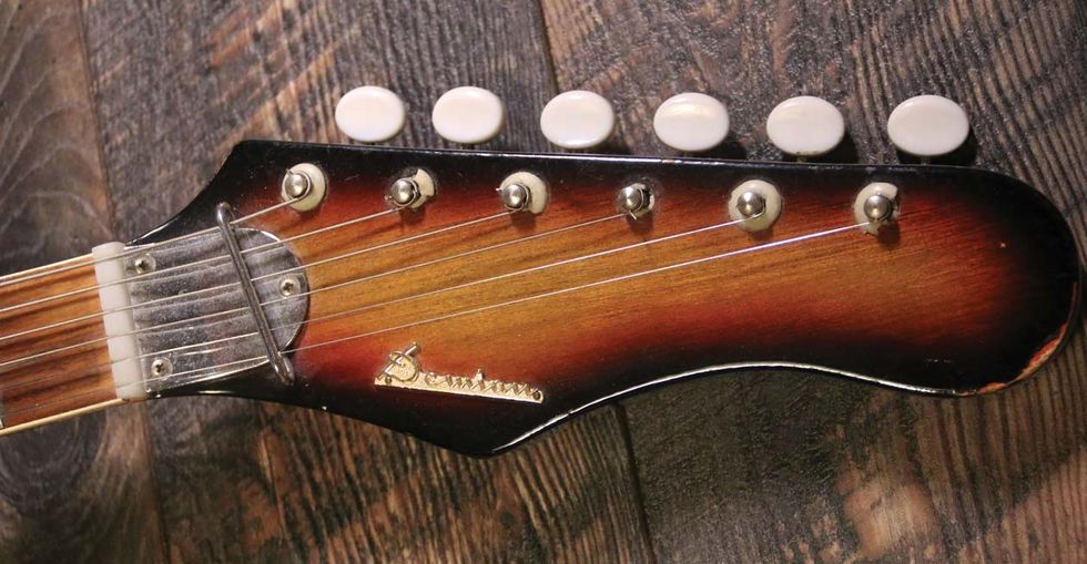 With some sleuthing, the answers started coming in. What we were very lucky to have was an extremely rare Demian VN-4 baritone electric guitar from 1964 made by the FujiGen instrument manufacturing company in Matsumoto, Japan. This was extra exciting for me, because the history of this company is extraordinary. FujiGen has been a keystone in Japan-based guitar building for ages. In addition to the brands St. George, Zim-Gar, and their own Demian imprint, they've made guitars for Teisco, Guyatone, Kawai (think Hound Dog Taylor's S180), Ibanez, and even Fender. I was holding a part of that historic lineage in my hands. A VN-4 in good shape, like this guitar, might sell for up to $750, or scale down to $400 if it's had a rougher life.