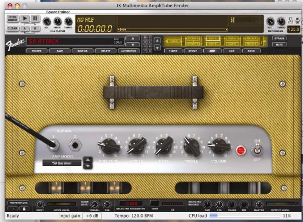 I first plugged in a Fender Vintage Classic ‘50s Strat model with Don Mare pickups. AmpliTube Fender defaults to the ’65 Twin Reverb and I was immediately struck by the sound. It was warm yet crisp, and I was especially impressed by the reverb modeling (certainly one of the best I’ve heard).