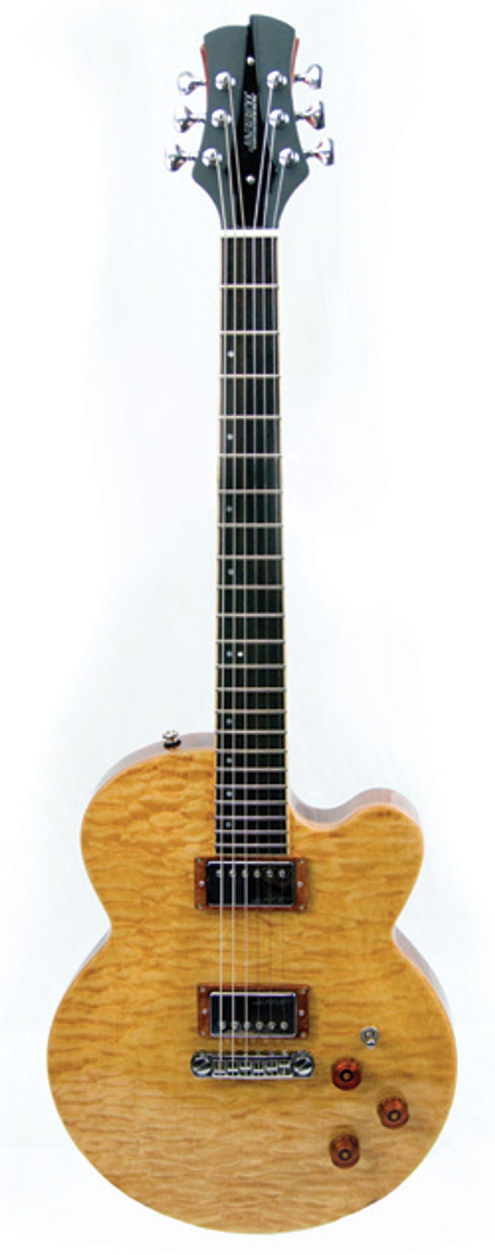 I’ll just start off by telling you that I like this guitar. I like its looks, and though the neck shape isn’t quite what I would pick, it just flat-out feels good. Although our sample isn’t the “jazz” model, it still feels like a jazz guitar. The neck is somewhat wide-ish and fairly thin, but not shredder thin. The ebony fingerboard is bound and the finish work on the frets is great, as you might expect from someone that builds them “one guitar at a time.” The frets are not super jumbos, and are in fact fairly low profile which can make bending a bit of a problem for some. But for straight head jazzin’, this guitar is simply the real deal. Low—and I mean loooooooow and comfy—action that feels like a guitar set at a way higher price point. Really, I can’t say enough about the great playability of this guitar except: excellent! Did I mention that the quilted maple top makes me drool?