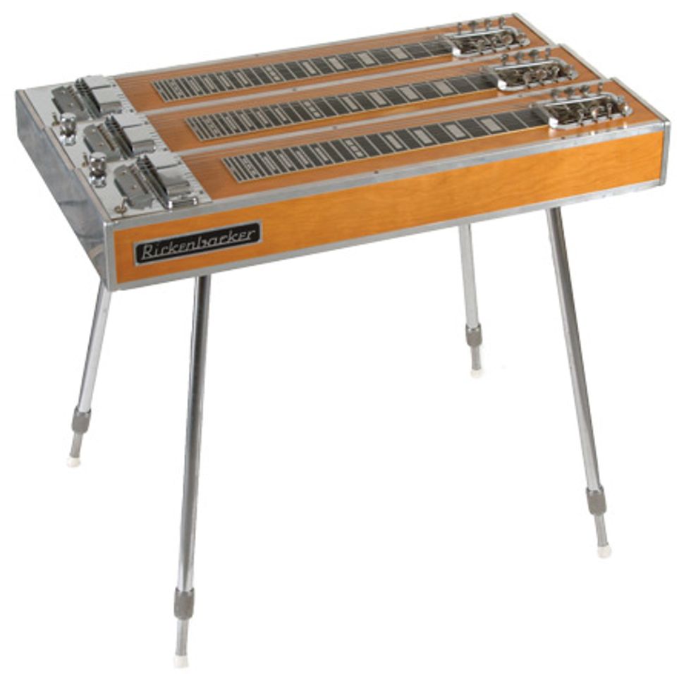 Each elevated neck features a horseshoe-magnet pickup and an on/off switch, and Master Volume and Master Tone knobs govern the entire instrument. This setup is described in a ’50s Rickenbacker catalog as “providing a player the ability to smoothly roll off volume to create desired shading and tonal effects and faster changes between necks.” The catalog goes on to say that the pickups enable “more chord combinations, fuller chords and greater harmony.” The guitar has natural-finished maple panels, the corners and sides are covered with polished aluminum caps, and the whole thing is supported by a stainless steel frame. To help prevent lighting reflections onstage, the 27-fret metal fingerboards are matte finished.