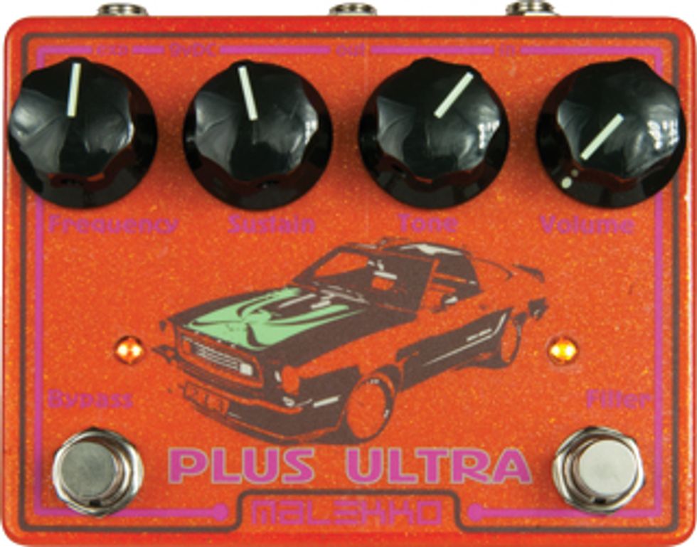 We’ve grown accustomed to stompbox companies big and small using pedal housings themselves as a canvas to differentiate their wares with a little rock ’n’ roll visual craziness. But it would be hard for a pedal to convey its intent through graphics more accurately or effectively than the Malekko Plus Ultra 213. Resplendent in orange metallic flake and a washed-out image of a Mustang Cobra II (Farah Fawcett and Cheryl Ladd’s ride of choice in Charlie’s Angels, natch!)—this pedal screams haze-of-smoke, Sabbathoid, desert-highway-shimmering-with-heat, shag-lined custom-van/muscle-car rock.