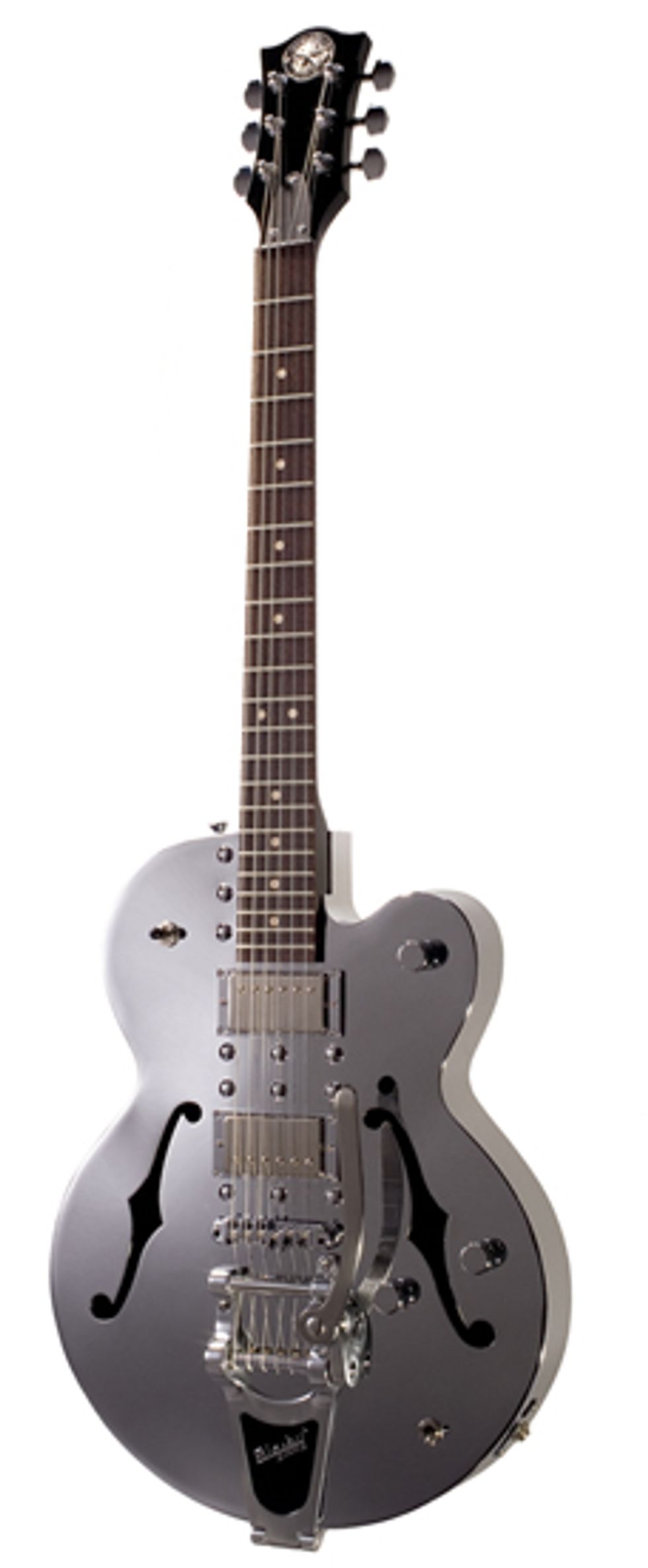 Made entirely of aluminum and featuring fat rivets up and down the front and back of the body, the Normandy looks like a militarized Gretsch 6120 from most angles, from its curvaceous singlecut design to the placement of the controls on its face. While the chrome version looks especially industrial— until the fingerprints start—there’s also a variety of metal flake and powder coat finishes conjuring up other hard-working vehicles, like school buses and army jeeps. Hardware enthusiasts will find a lot to like on this guitar, as the Normandy comes decked out in chrome components. It features two Volume knobs and a Tone control (all of the dome variety), a pickup selector on the upper bout, and a heavyduty kill switch hiding innocently behind a Bigsby B70 tailpiece. An adjustable locking roller bridge sits behind two humbuckers, both of which are made by Normandy, and are, of course, encased and surrounded by chrome. It’s truly a sight to behold, and odds are you’ll spend plenty of time just looking at the guitar if you add one to your arsenal.