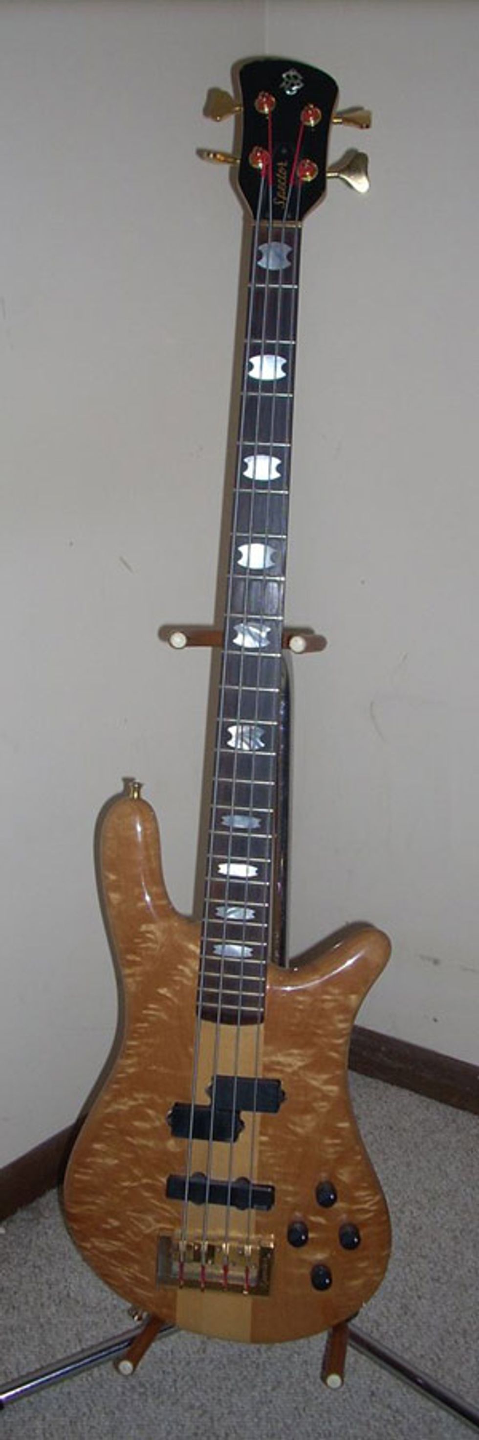 The photos below are of my beloved 1985 Spector NS2 bass that was bought at the 85 NAMM in New Orleans. The story behind it involves a bass legend, who befriended me for three years. I took music lessons from a Rockford, IL music store owner. He gave me credentials to attend the '85 NAMM. While at the opening day I went to see John Entwislte at the Sunn booth. I am a long time Who fan and knew about John working with Ringo's son, Zax. Anyway, after John was done playing and signing autographs I was able to talk to him about Zax Starkey. Since John was very talkative we walked and talked for quite sometime and then stopped in front of the Warwick Buzzard bass booth. That booth was right by Spector Guitars. John wanted to look at the Buzzard basses, and I wanted to see the Spectors.