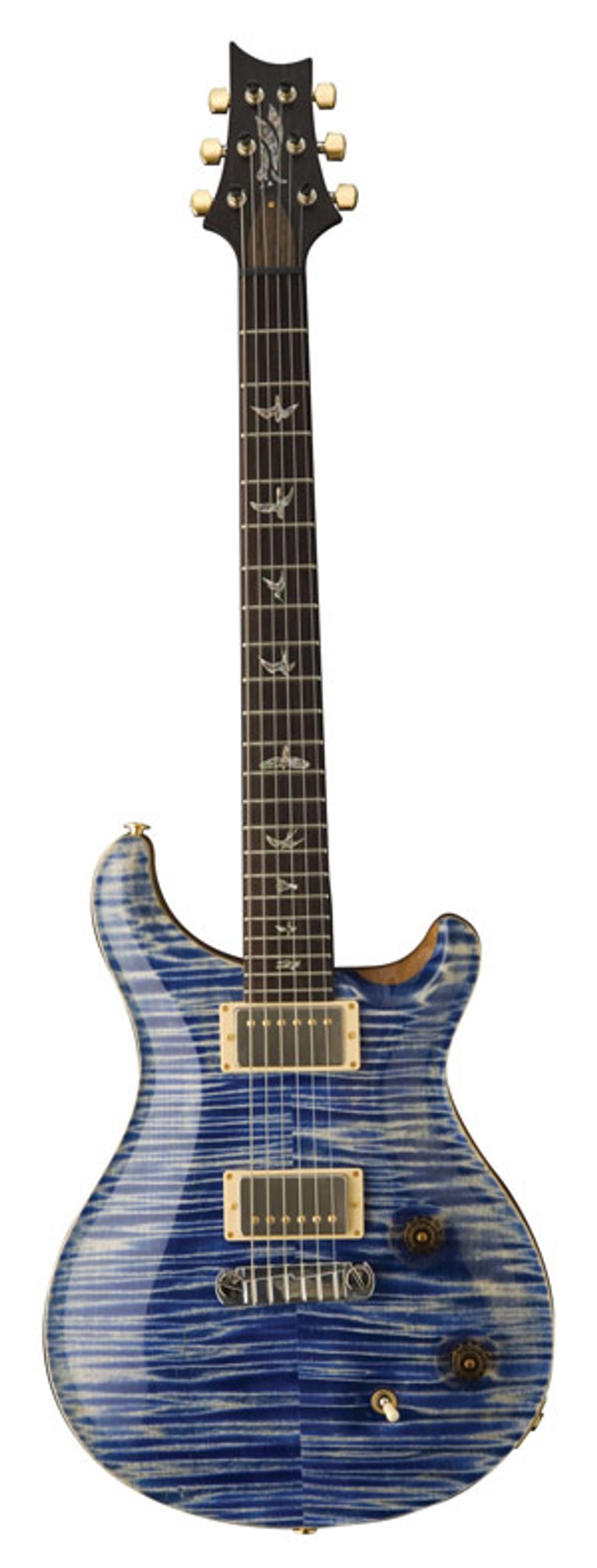 The reviewed MEII features a highly figured curly maple top with mahogany back and a high gloss nitro finish in what PRS calls “Faded Blue Jean.” It sports a 25” scale length (right in between Gibson and Fender) with a black rosewood 22-fret neck and fingerboard that is decorated with green abalone bird inlays and iridescent paua heart centers. The neck profile is both wide and fat, giving the neck substance and comfort with easy access all the way up to the 22nd fret. The bridge is PRS’s own stoptail that allows for individual string intonation adjustments, as well as two screws for overall adjustment. Tuners are 14:1 Phase II low mass locking grommet style, and the pickups are the newly introduced 1957/2008 treble and bass pickups, which are wound at PRS with original pickup wire used in 1957 on our favorite humbucker from that era. Finally, there is a volume and tone control with 3-way toggle pickup selector and nickel hardware. This is a nicely appointed guitar.