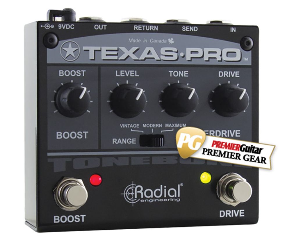 Like Radial’s DIs, the Canada-built Texas Pro is ridiculously robust: heavy gauge steel, smooth, precise, and sensitive controls with perfect resistance, a smart effects loop, and switches and jacks that seem impervious to wear. The layout, too, is simple and sensible, with streamlined control sets for the boost and overdrive arrayed across the compact 4 1/2" enclosure.