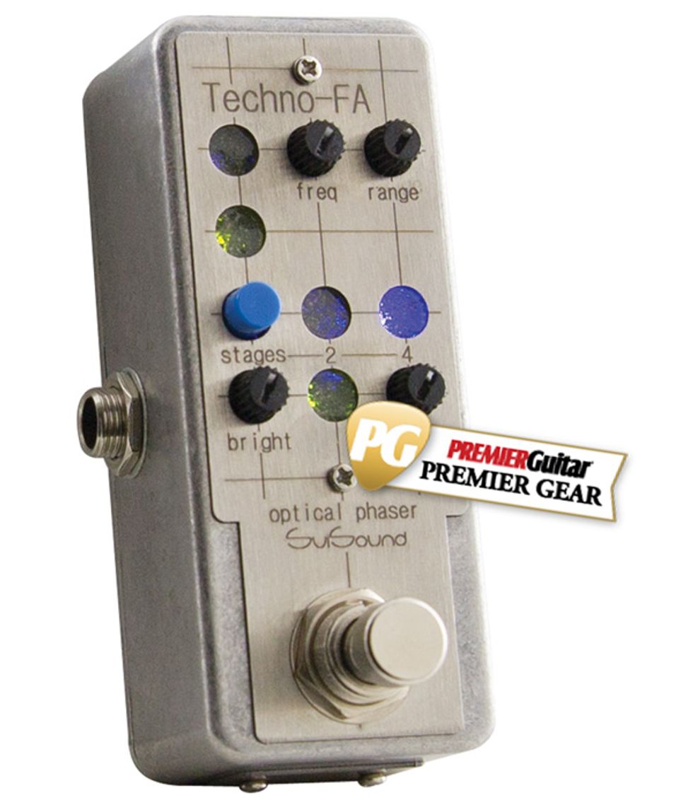Hailing from Count Dracula's favorite shipping port (Varna, Bulgaria), the SviSound Techno-FA is, pound for pound, inch for inch, one the most powerfully addicting phasers on the market. Packed into its 1.5" x 3.6" steel housing is an analog circuit with four mini knobs—frequency (rate), range (how far the effect shifts in each cycle), bright, and depth—a pushbutton for selecting two- or four-stage phasing, and a slightly confusing array of sci-fi-cool LEDs indicating effect status, stage selection, and phasing rate.