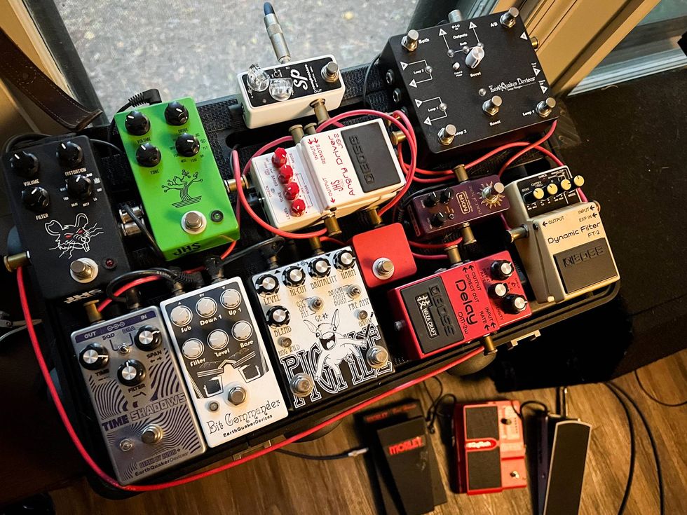 Board #1 (front of amp): guitar into Ernie Ball VPJR, DigiTech Whammy 4, Morley Bad Horsie, Xotic SP Compressor, Boss FT-2 Dynamic Filter, EarthQuaker Devices Swiss Things—loop 1 out to MXR Duke of Tone, Electrofoods Ultd Pigpile fuzz, EarthQuaker Devices Bit Commander, EarthQuaker Devices Time Shadows V1, Boss JB-2 (with JHS Red Remote), JHS Bonsai, JHS PackRat, Boss DM-2W to loop 1 return.