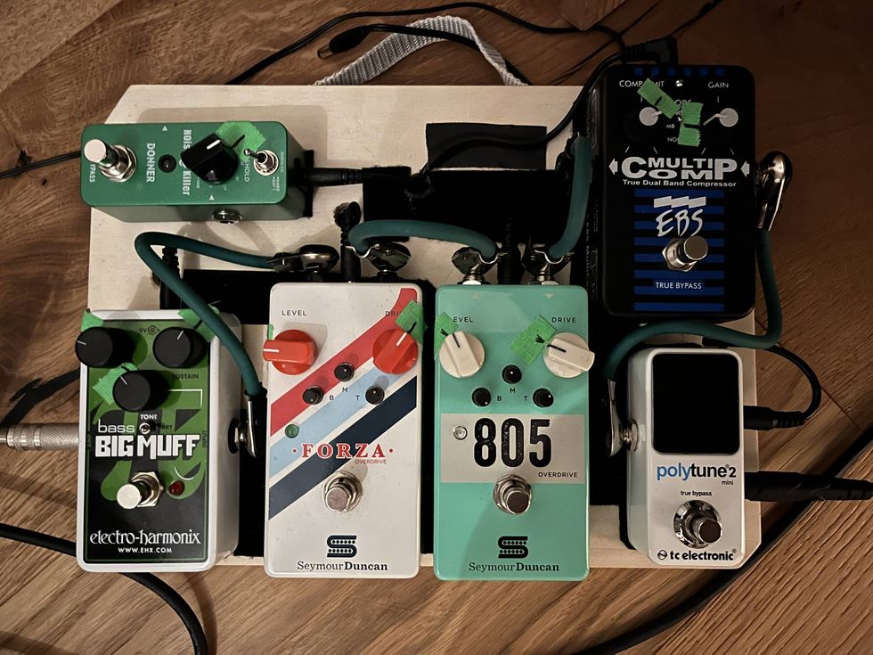 My bass pedalboard: Starting with a TC Electronic PolyTune 2 tuner, the signal goes into a Seymour Duncan 805 Overdrive, then a Seymour Duncan Forza Overdrive, an Electro-Harmonix Bass Big Muff, and finally a Donner Noise Killer. [An EBS MultiComp sits top right as well.] All on a board made out of bamboo and plywood, giving a fresh vibe on the stage!