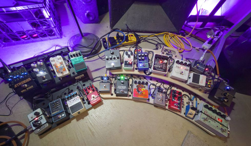 Fender Hot Rod Deluxe signal chain: Electro-Harmonix Mel9, Electro-Harmonix Key9, DOD Gonkulator, Electro-Harmonix Nano Big Muff Pi, PRS Horsemeat Transparent Overdrive, Boss SL-2 Slicer, Electro-Harmonix Canyon, Fender Waylon Jennings Phaser, Way Huge Atreides Analog Weirding Module.