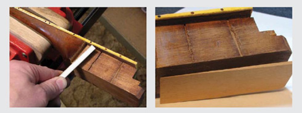 Next, I tensioned up the outer two strings, checking for neck pitch, vertical alignment, and downward adjustment of the ABR-1 bridge. Once I’d established the neck angle, I cut a Honduran mahogany shim (measuring 1/8" thick x 1 15/32" wide x 4 1/4" long), and sanded it to a minus 2-degree pitch. Then I glued it to the bottom surface of the extended neck tenon using #20 medium Super Glue. I chose Super Glue as the adhesive because the mahogany shim is a permanent addition.