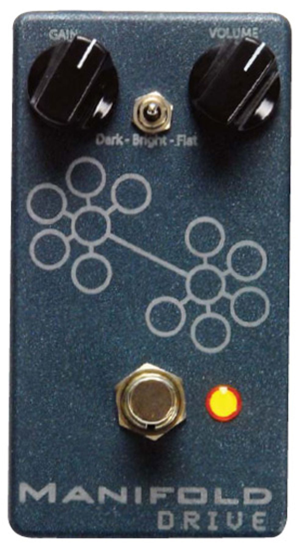 The Manifold Drive is built around a simple control set of two knobs—Gain and Volume—and a 3-way EQ switch that selects Dark, Bright, or Flat settings. The EQ switch is the key to this little wonder of a pedal, giving the player more control to fine-tune tones for various guitar and amp combinations. For example, the Dark setting can be used to compensate for the inherent spikiness of a Stratocaster neck pickup and a Twin Reverb, while the Bright setting can enliven the wooly sound of a 15" speaker being driven by an ES-335’s neck pickup. The pedal runs on a 9-volt battery and ships with a short adapter cable that lets you use a power supply rated between 9V and 18V DC.