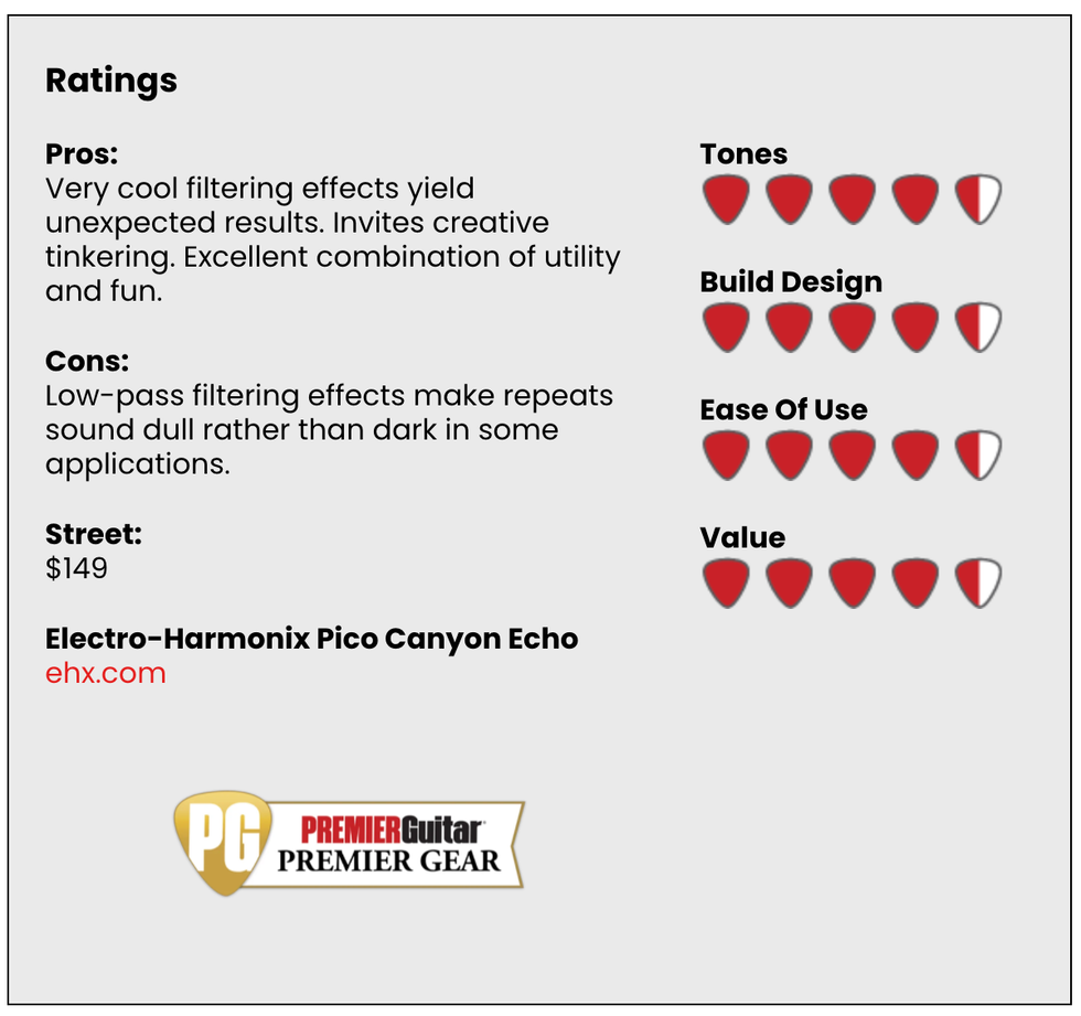 The Pico Canyon Echo is as engaging as any delay I can think of in a package this size. It’s flexible and full of surprises, thanks in large part to the cool filter control, a super-wide 8-millisecond-to-3-second delay range, and an infinite repeats function that effectively functions as a looper.