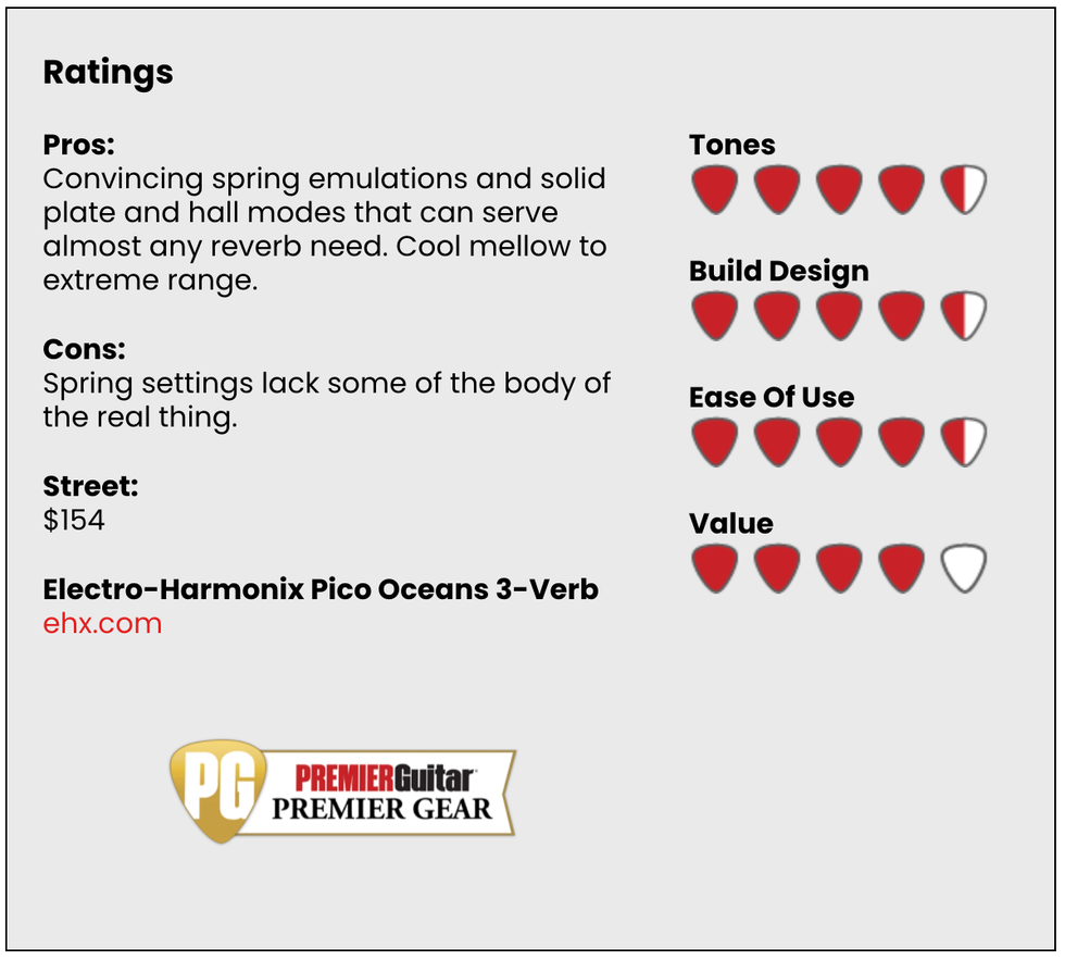Like the Pico Canyon, the Oceans 3-Verb inhabits a crowded market space that ranges from ultra-low-priced imports to fancier fare. But while the Pico Canyon distinguishes itself from the competition with a wide range of straight-ahead to weird sounds, the Oceans 3-Verb mostly focuses on fundamentals. Here, that means digital emulations of spring, plate, and hall reverbs. The 3-Verb’s one great wild-card feature is its infinite reverb, which works in the hall and plate settings. It’s an awesome addition that ups the fun quotient exponentially and makes the 3-Verb an appealing option for noise, drone, ambient, and other experimental artists.