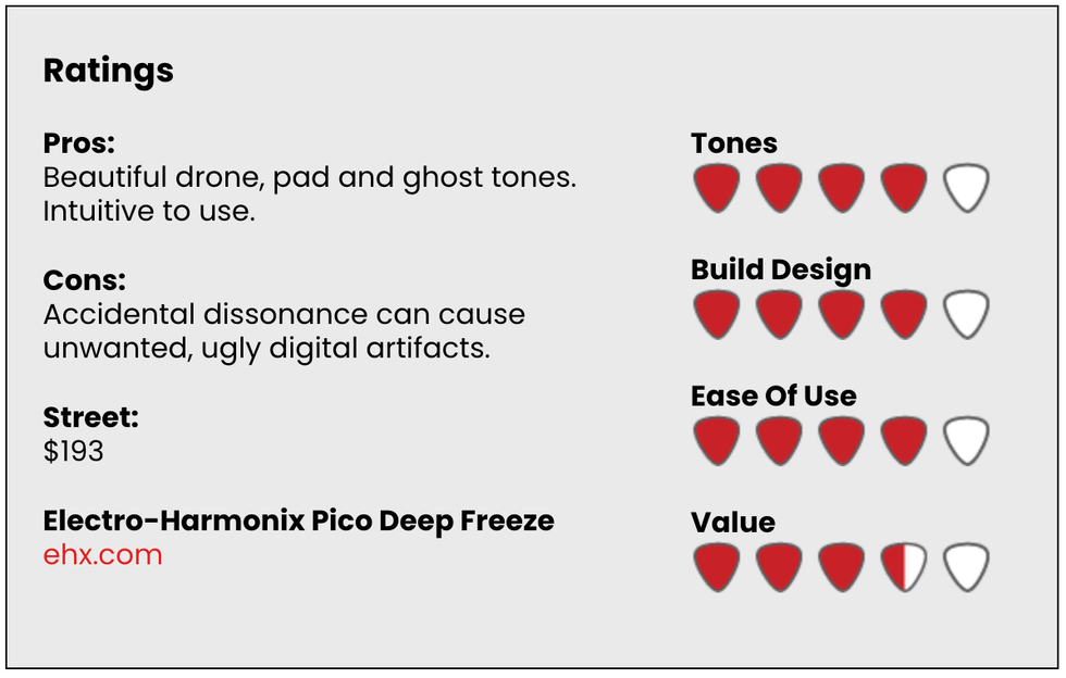 Not every player needs an EHX Freeze. But a lot of players don’t know what they’re missing. The Freeze inhabits an interesting place among guitar effects. It is, in effect, a little sampler that grabs your signal and freezes it for a given period—sometimes infinitely. A freeze is different than just a sustained tone. There is a lag in a freeze capture that can add many overtones. They can be pretty or ugly, depending on the moment you capture, the relationship between dry and effected signal, and how long you freeze the audio picture you capture. Put another way, the Freeze can be a drone machine, a chilly digital cimbalom, a tamboura in a box, a synth-generated sine wave, a freeze-frame ring modulator, or a distant ship’s horn sounding through the fog. Getting predictable and harmonious outcomes can take a steady hand, a bit of concentration, a smooth touch, and familiarity with how the Freeze’s interesting controls interact. But in and among these strange tone relationships await interesting sounds that can add gobs of extra vocabulary to your electric guitar expressions.