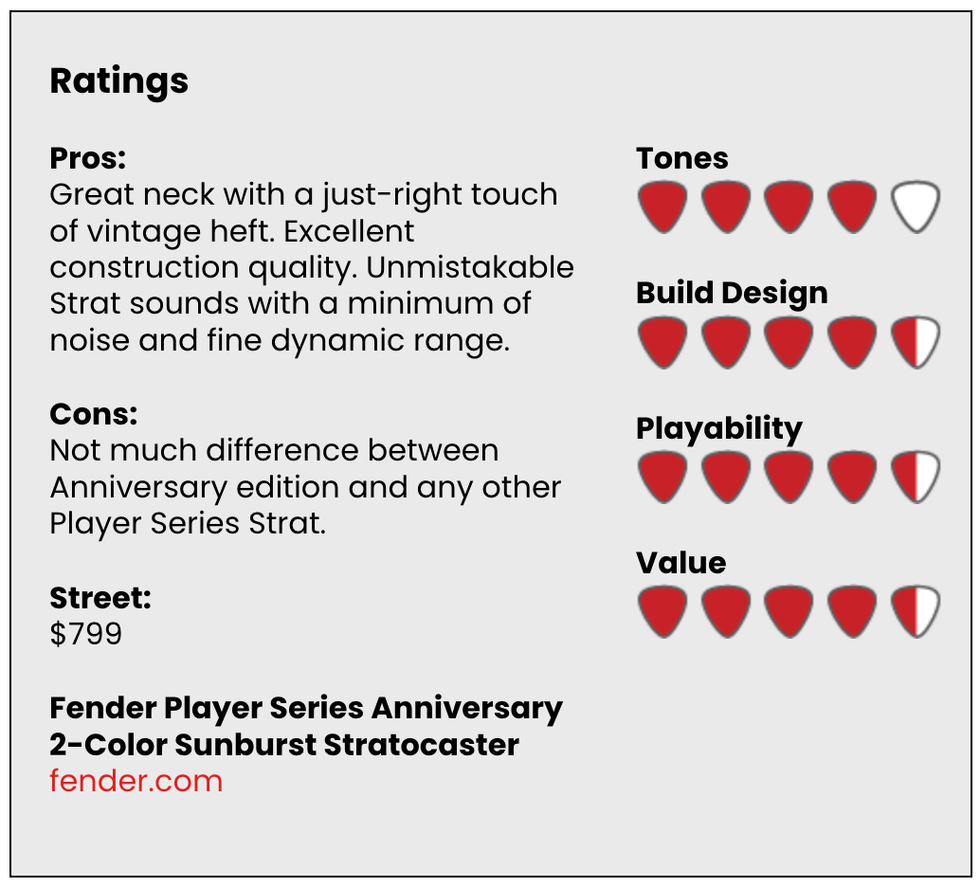 I think Mexico-made Fenders are awesome. A lot of my friends do, too. Some have made MIM Fenders their No. 1 instrument. And though a few may have switched in new pickups or made modifications here and there, I’ve heard some of the same people express regret for spending money on improvements that didn’t improve the guitars in any measurable sense. If you get a good one, Mexico-made Fenders are still among the best deals in the business, and our review Player Stratocaster Anniversary plays beautifully, sounds exciting and pretty, is built rock-solid, and exudes plenty of mid-century Stratocaster essence.