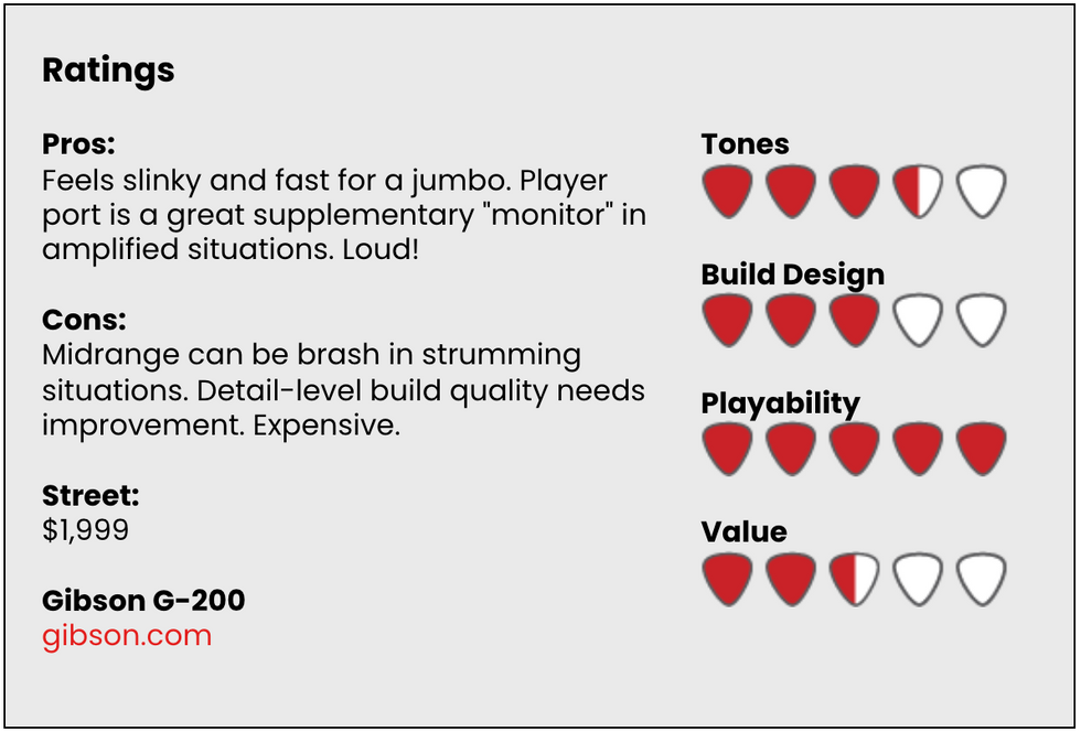 The bass tones are quite pleasing—a quality revealed, again, by the presence of the player port. And if you use a lighter, more dynamic flatpicking approach, you can coax a much more even tone profile that lets the resonant low end and ringing highs shine. Jangly Johnny Marr and Peter Buck arpeggios sound lovely for this reason—especially when you use a capo. In fingerstyle situations, the guitar feels a little less dynamic and balanced, largely because coaxing an even response from a body this big takes a fair bit of muscle. But when you do get a feel for how to make the G-200 sing with a lighter touch, the walnut and spruce tonewood recipe dishes some very pretty tones, indeed.