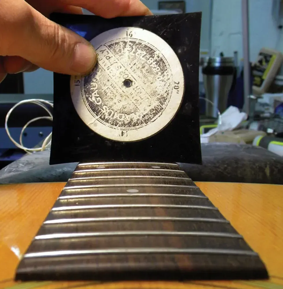 Preliminary check. Before starting this kind of work on a guitar, it’s important to tune to concert pitch and take measurements. These specs provide a baseline to help gauge your progress. You’ll be taking several measurements, so write them down as you go.