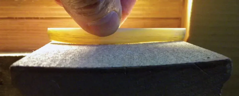 Using a 14" radius block and self-adhesive 80-grit sandpaper, I sanded the top of the saddle until it matched the block’s radius. Here’s the most accurate way to reshape the top of the saddle: Place the radius block in a vise with the radius side up and affix the self-adhesive sandpaper to the block. Now remove the saddle from its bridge slot, turn it upside down, and gently sand its top in the block’s concave area. If you shine light behind the saddle, you’ll be able to see how much material you’re removing from the saddle and make sure its radius matches the block (Photo 3).