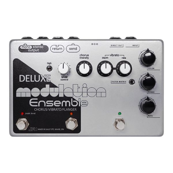 That’s a task that Jordan Fresque—the namesake builder behind Sault Ste. Marie, Ontario’s JFX Pedals—has committed significant time and energy into tackling. His Empyrean is a five-in-one box dedicated to Frusciante’s drive and dirt tones, encompassing fuzz, boost, and preamp effects. And his four-in-one, all-analog Deluxe Modulation Ensemble reviewed here is another instant Frusciante machine.