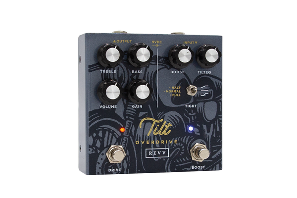 The Tilt is a new collaboration between Revv and session ace Shawn Tubbs that combines a robust medium-gain overdrive with a nuanced clean boost. Around Nashville, Tubbs has a reputation for burning lead lines and immaculately crafted tones. Designed to emulate the feel and response of a cranked single-channel amp, the Tilt absolutely nails the mission at hand. The overdrive circuit is based on LED clipping and features a rather simple control setup with volume, gain, bass, and treble. On the other side you have a 12 dB clean boost with two rather interesting controls: tilteq and a three-way tight toggle switch.
