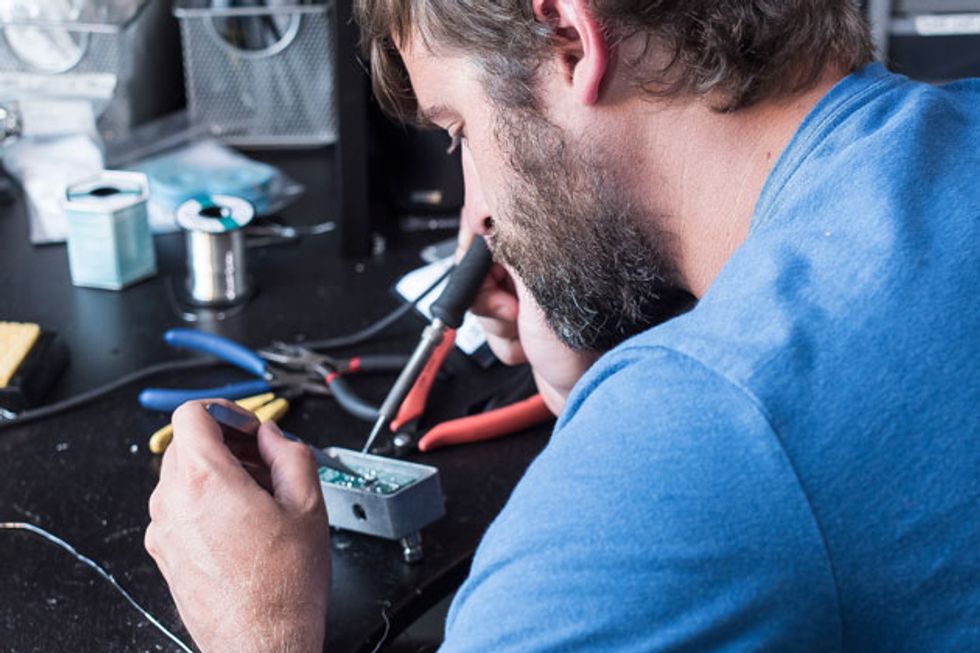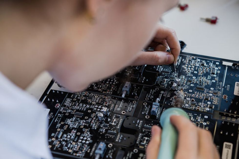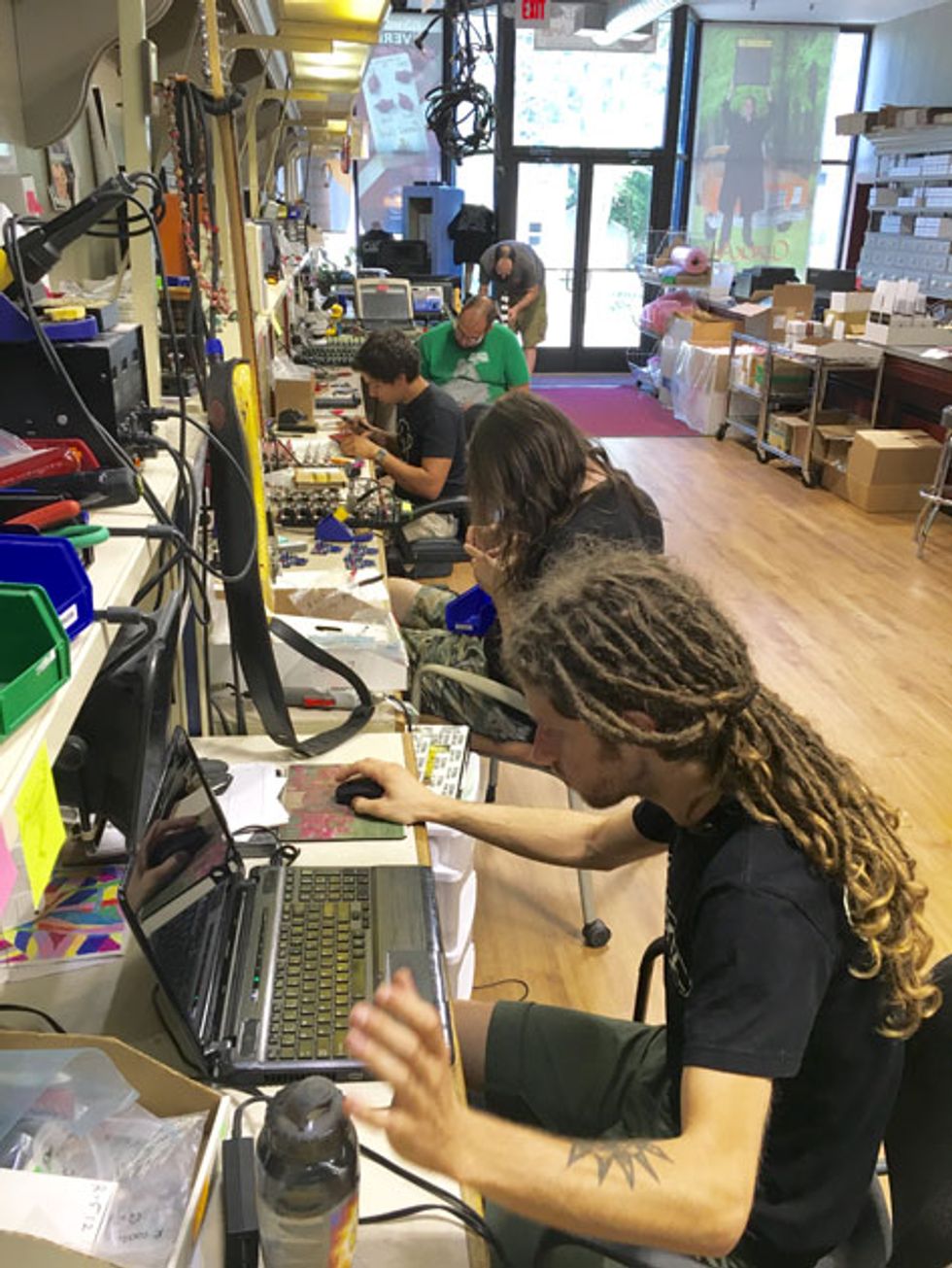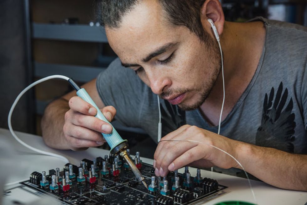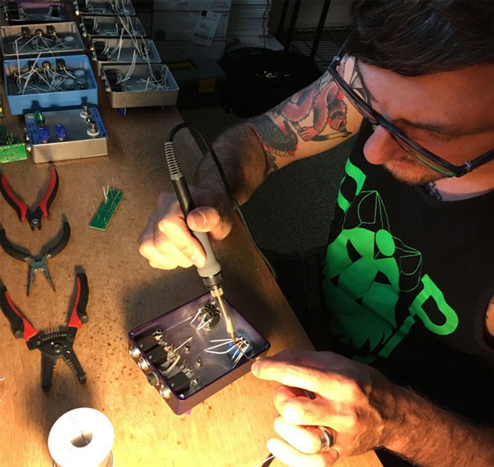 Enrique “Quique” Rangel solders a connection. All Darkglass effects are built in Finland in the company’s