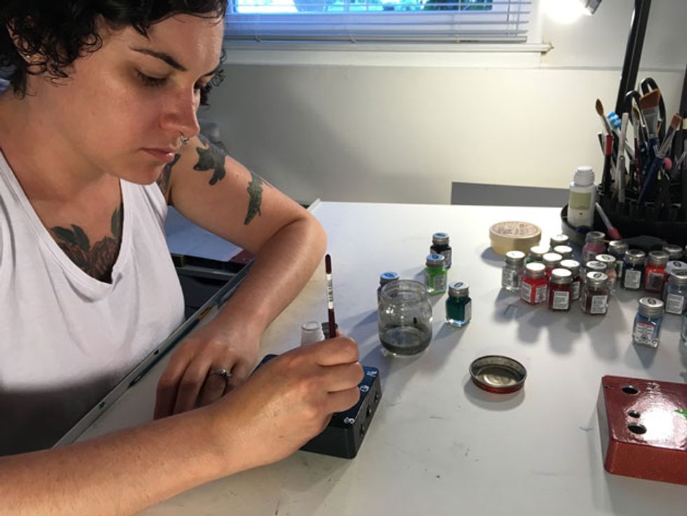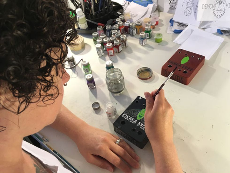 Fuzzrocious pedals is a Ratajski family affair. Ryan handles electronics design and business, while Shannon (shown here) does the painting—sometimes with the help of their kids.