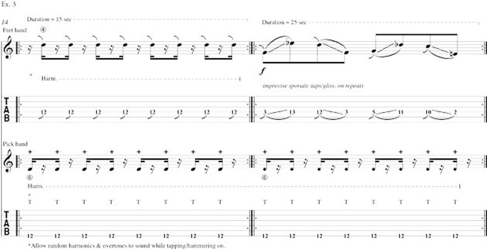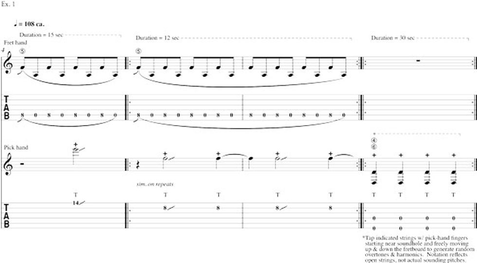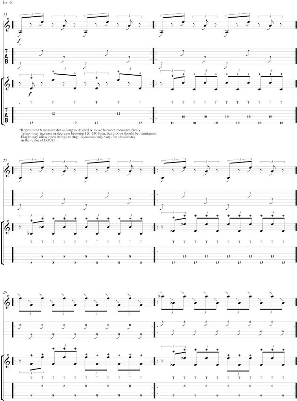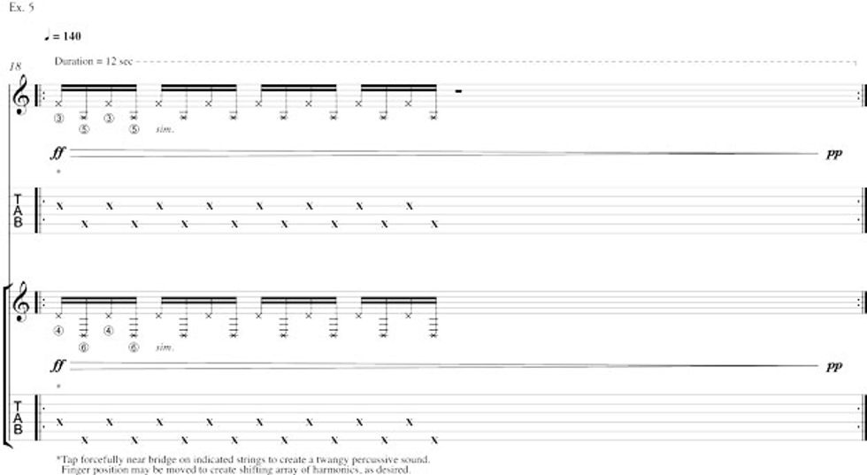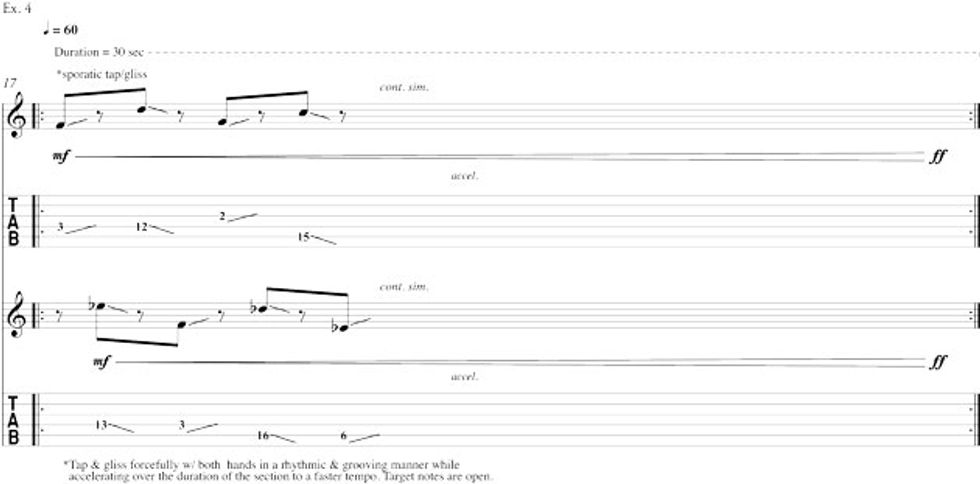 In measure 4 (Ex. 1), the fretting hand maintains the two-note ostinato while the picking hand (using the index finger) first taps a gliss up, followed in measures 5 and 6 by a series of slow Fs leading to the quarter-note taps on the 4th and 6th strings, which move freely up and down the string. Depending on the strength of your attack, you will hear different upper partials, ringing harmonics, of the open strings.