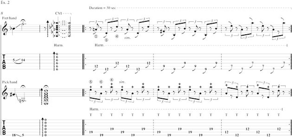 In Ex. 2, we begin to zoom in to the array of harmonics in measure 8, with both index fingers used to tap a pitch then slide it into a held note. In measure 9, the fretting hand brushes the open strings followed by the picking-hand index finger brushing across the strings with the other hand held softly across the strings at the 6th fret to yield the indicated harmonics.