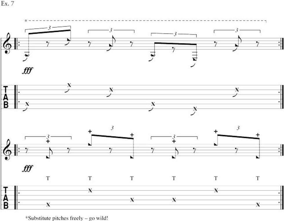 In Ex. 7, the penultimate measure 30, the noteheads indicate the variability of pitch. Any notes may be used. With practice, the player can generate patterns based on visual sequences on the fingerboard ... or just plain-old randomness. Don't be afraid to go wild, as you may be surprised at the results. We might consider this section to be a perfect balance of chaos and flow.