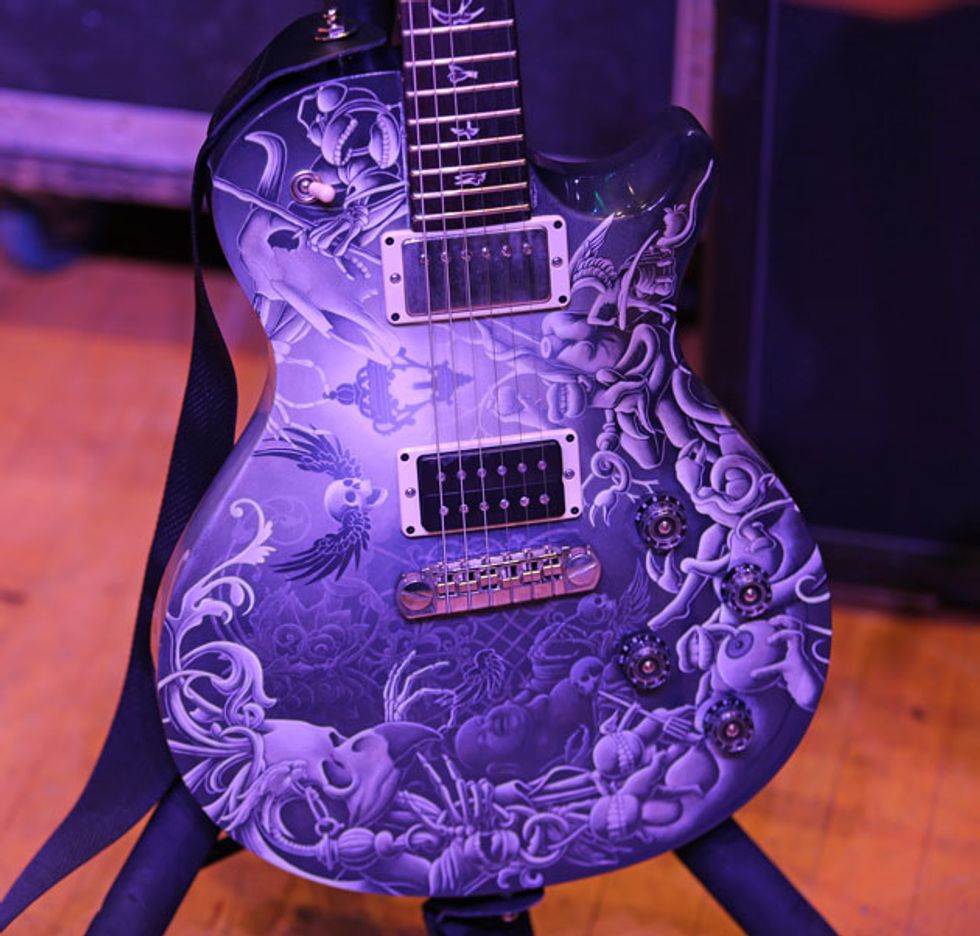 Tremonti’s most striking guitar is this Tremonti PRS with artwork by English artist Joe Fenton. It’s tuned down a half-step to Eb.