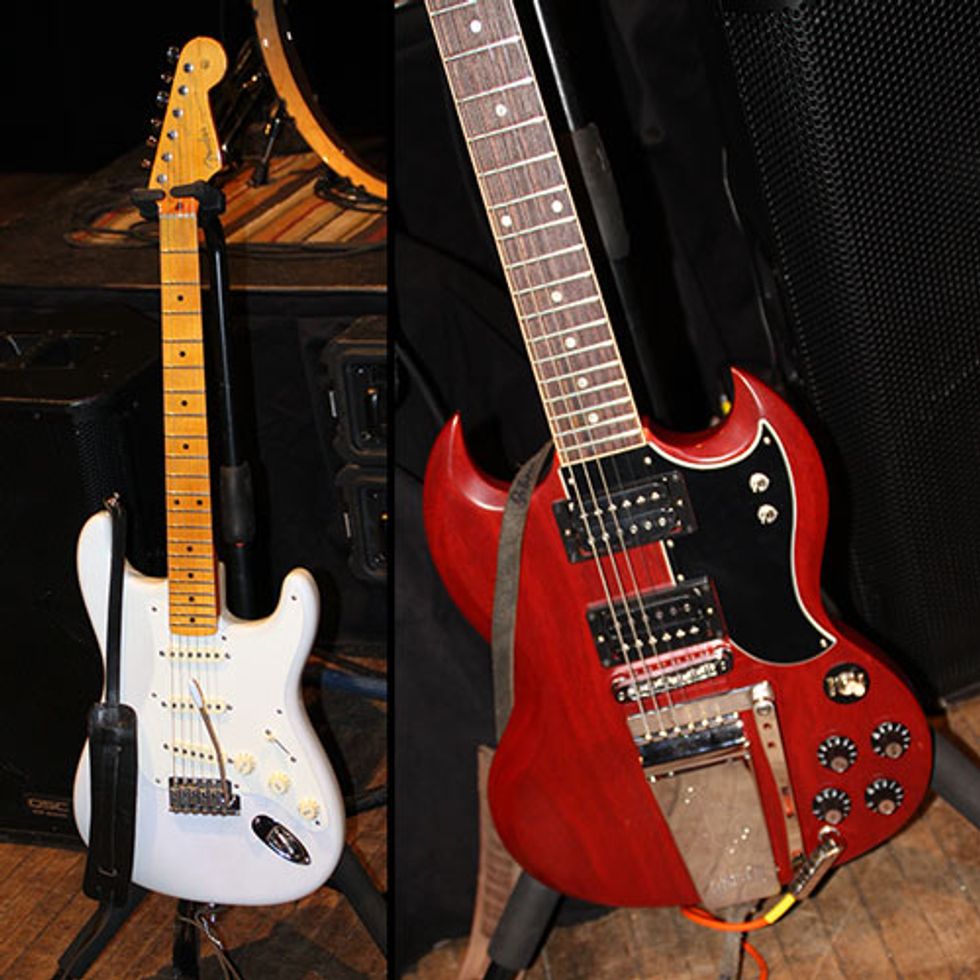 For the single-coil tones, Dweezil brings out a mostly stock Eric Johnson signature Strat. In order to quickly move to an acoustic sound, Dweezil installed a bridge with a piezo pickup. He's also playing a prototype of a (hopefully) forthcoming signature model from Gibson. Based off of Frank Zappa's "Roxy"-era SG, it sports a white headstock, a series/parallel switch, and a phase switch–both located on the lower bout.