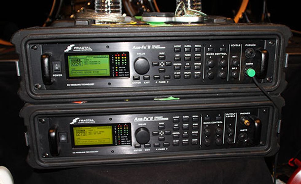 The heart of Dweezil's tone comes from a Fractal Audio Systems Axe-FX II. In previous versions of his rig he actually ran two units simultaneously due to the CPU demand that his custom presets required. However, on this “Zappa Does Zappa” tour he runs everything through the top unit and the bottom is used as a backup or for any guests that might sit in. In order to recreate his father's famous tones, Dweezil goes back to the master tapes to study and cop every little detail in order to program the Axe-FX II presets.