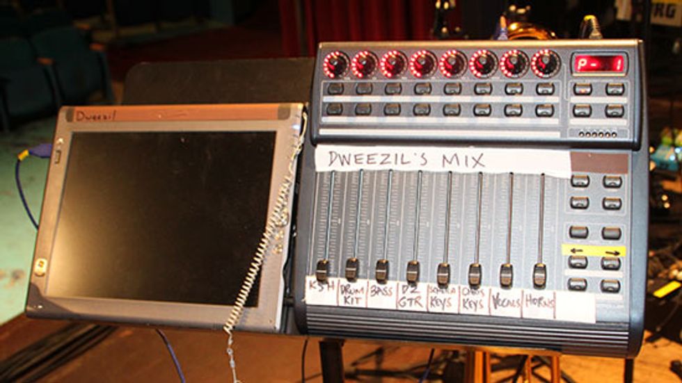 In order to play incredibly intricate music, each musician in the band is able to control their own monitor mix via a touch-screen tablet along with a Behringer mixer. This allows everyone to adjust on the fly depending on the song and stage volume.