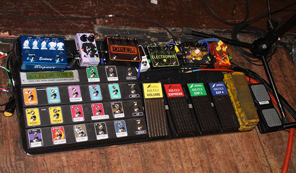 All of Dweezil's effects are run through the front of the Axe-FX II, rather than the effects loop. Along the top is a Bogner Ecstasy Blue, JAM Pedals Fuzz Phrase, SolidGoldFX Formula 76, TC Electronic PolyTune Mini, SolidGoldFX Electroman, JAM Pedals Big Chill Tremolo, and JAM Pedals Red Muck. Along the front of his board is the MFC-101 MIDI Foot Controller for the Axe-FX II and four expression pedals–the first one is for volume and the other three change function depending on the preset.