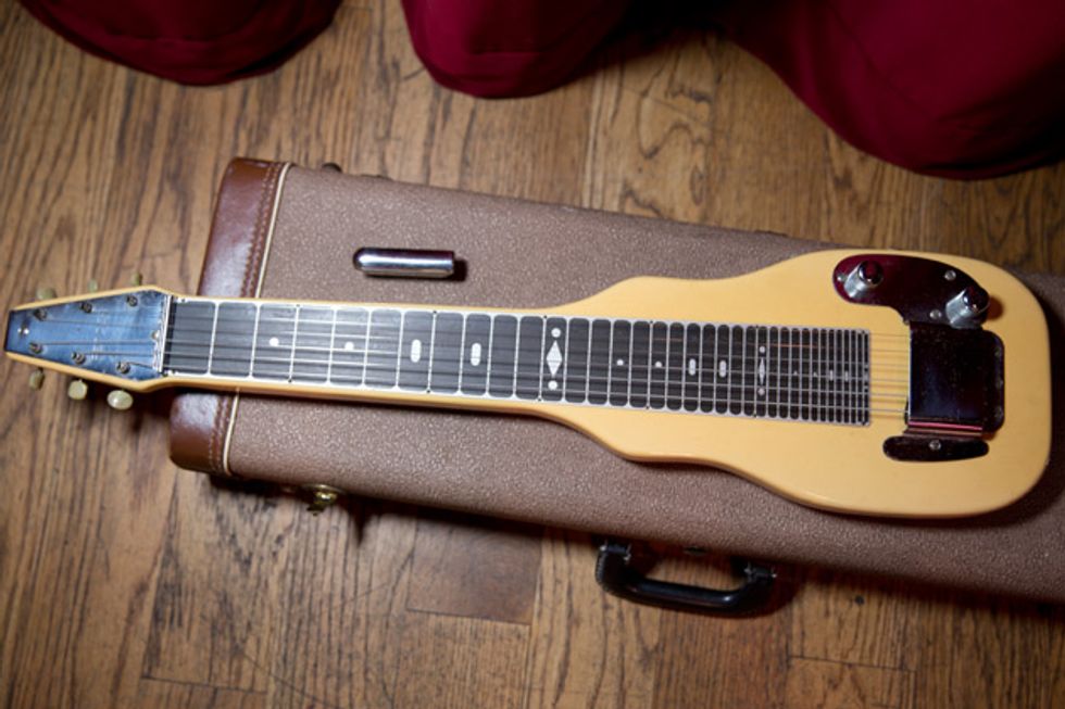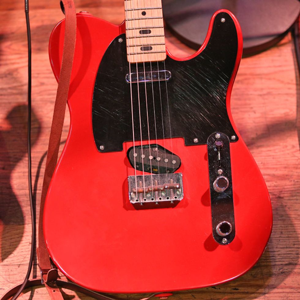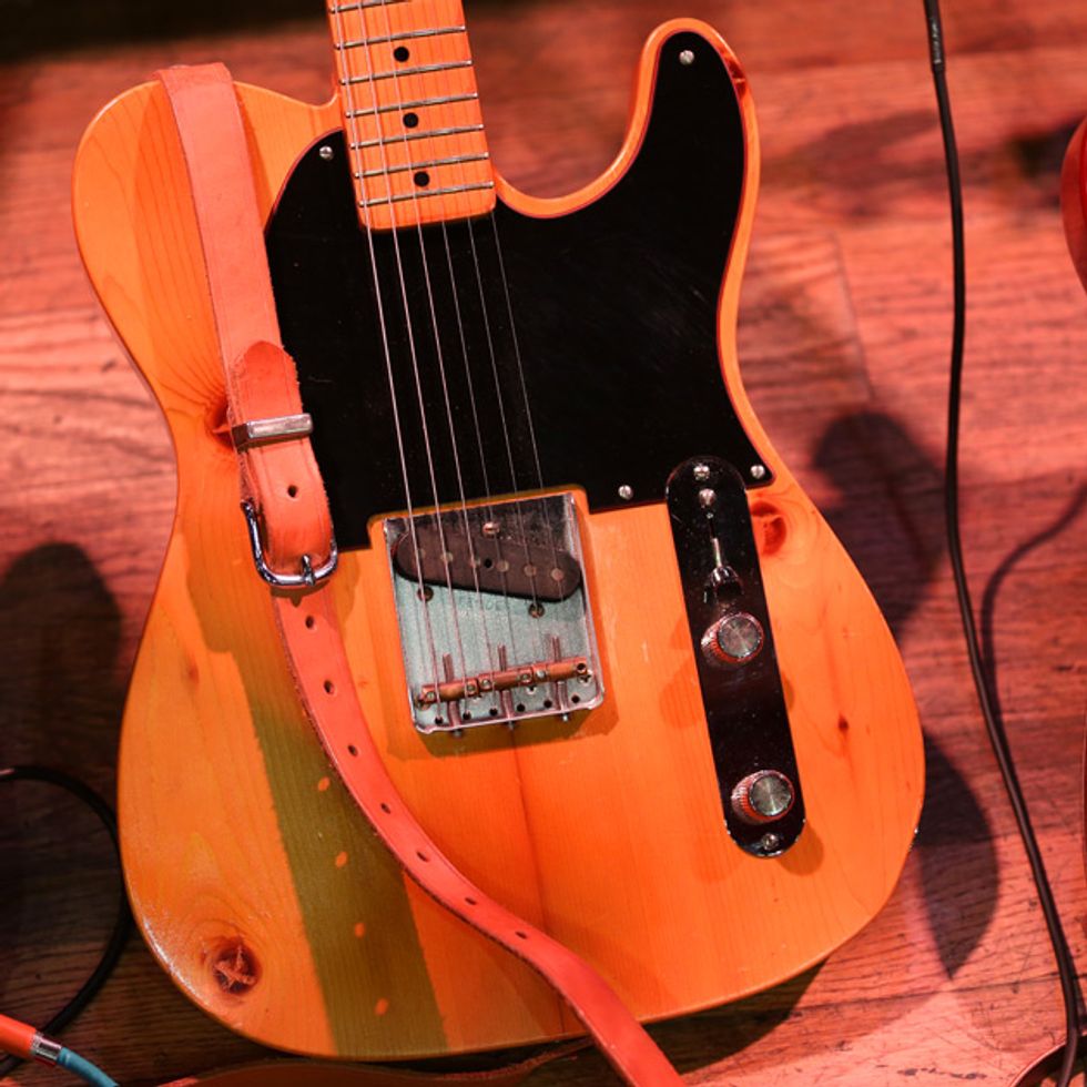 Next in the lineup is G.E. Smith’s T-style build by Rick Kelly of Kelly Guitars. This guitar features a pine body and neck cut out of ancient beams taken out of a building torn down in NYC’s Bowery neighborhood. Because of that, the guitar does not have a truss rod because the ancient wood does not move. The single pickup came from a ’51 Telecaster.