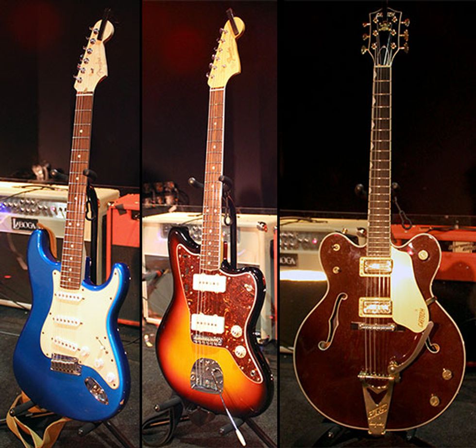 During this run, Robinson brought out three guitars–a Fender Strat, a Fender Jazzmaster, and a Gretsch 6122 Chet Atkins Country Gentleman. The Strat was the first guitar Robinson bought for himself when he was around 14. He recently put a new neck on it–afters years of truss rod misuse when he was younger–and installed Mick Brierley pickups. The Gretsch is entirely stock with the exception of TV Jones pickups. All of his electrics are strung with a .010 set of Elixir strings with the high string replaced with a .012.