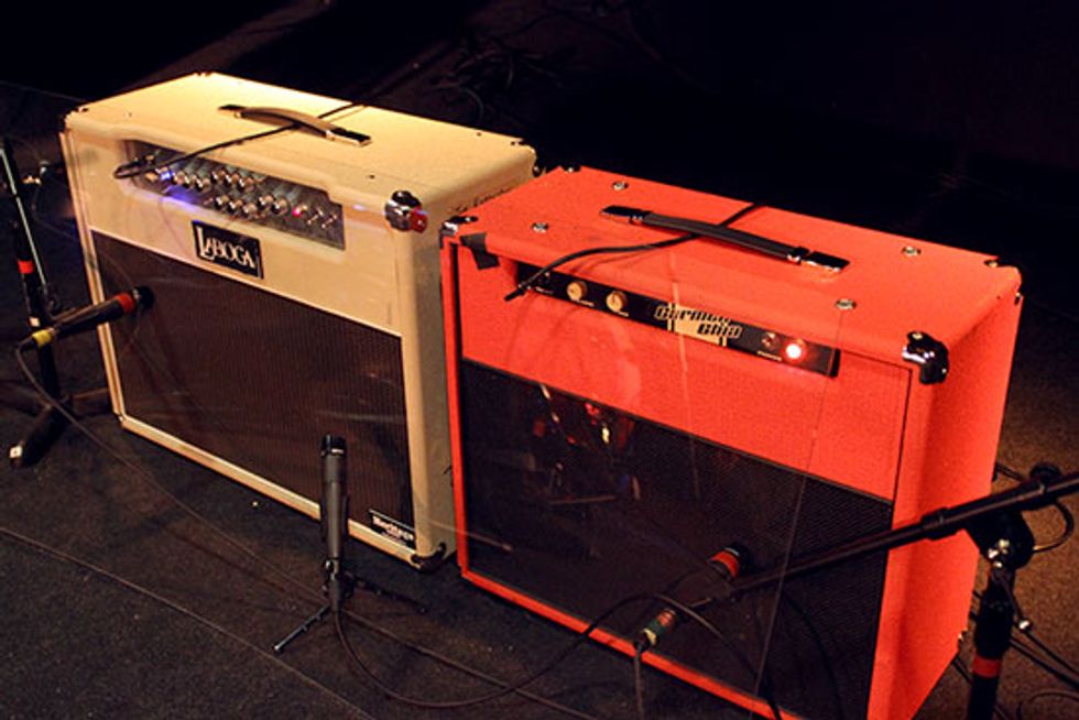 For his electric trio shows, Joe uses a dual amp setup consisting of a Laboga Alligator 30 and a Dr. Z Carmen Ghia. An avowed fan of Class A amps, Robinson runs both amps all the time with only his reverb (and occasionally the delay) run in stereo. Since both are run pretty hot he places a sheet of plexiglass in front to keep the front row happy.