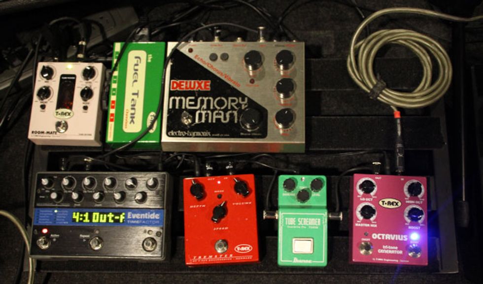 For his main electric rig pedalboard, Robinson uses a T-Rex Octavius, Ibanez Tube Screamer TS808 reissue, T-Rex Tremster, Eventide Time Factor, Electro-Harmonix Deluxe Memory Man, and a T-Rex Room-Mate all powered by a T-Rex Fuel Tank. Off to the right of this board he has a Crybaby Wah, Ernie Ball Volume Pedal, and a Peterson StroboStomp 2.