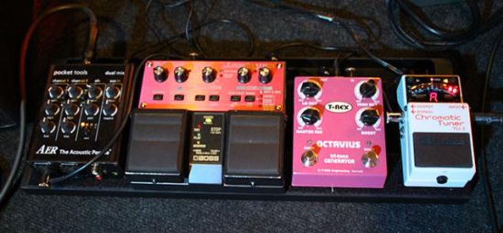 On the acoustic side, he plugs into a Boss TU-2, another T-Rex Octavius, and a Boss RC-30 Loop Station. For amplification he goes into an AER Pocket Tools mixer and then into his Compact 60 (not shown).