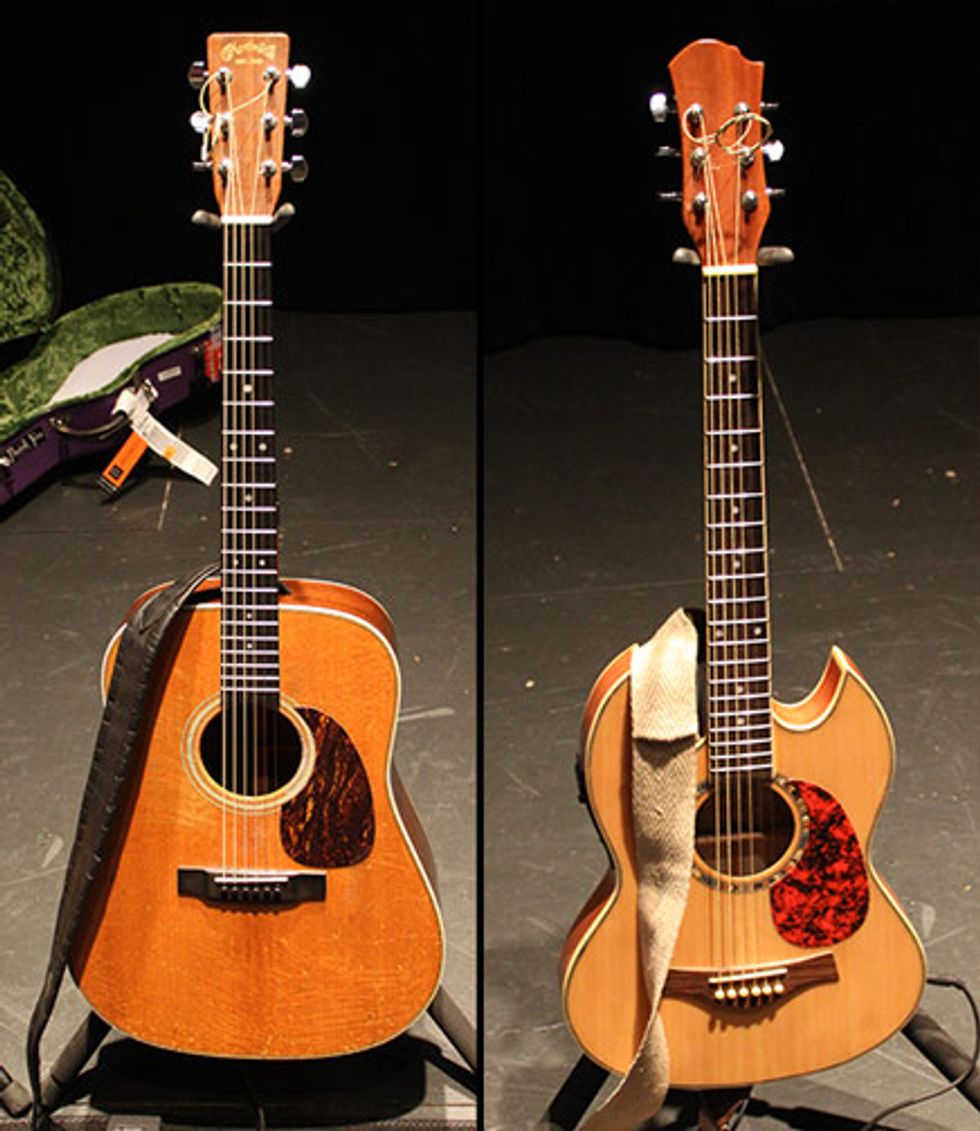 Keller's main workhorse is a Martin HD-28(L) from the early 2000s. It has "the low end of a beast" and is plugged direct into the PA. He also has another HD-28 that is used for more experimental purposes–such as adding a synth pickup or even cutting it in half. The thin-bodied guitar on the right caught Keller's eye online for $180 on Amazon when it was described as an "acoustic SG."