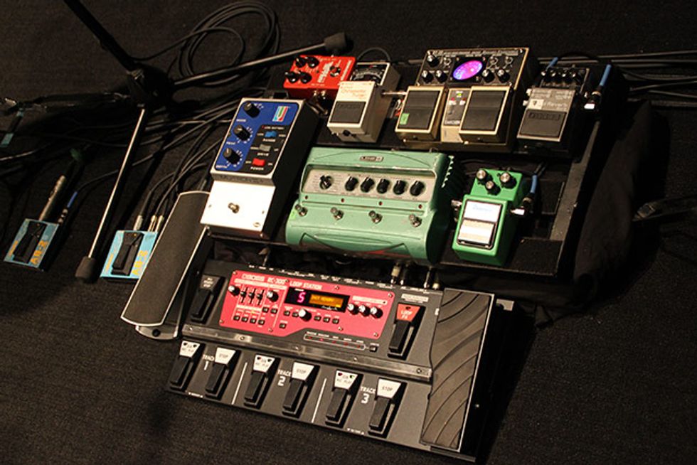 The heart of Keller's pedalboard rig is a Boss RC-300, which everything feeds into. His favorite effect–due to Jerry Garcia's influence–is the MuTron III. His other main effects include a Line 6 DL4, Ibanez Tube Screamer, Boss Digital Reverb, Boss RT-20 Rotary Ensemble, and a TC Electronic Hall of Fame Reverb. Keller is able to blend the effects with his dry signal via an Ernie Ball VP Jr. Volume Pedal. He runs everything direct with no amps.